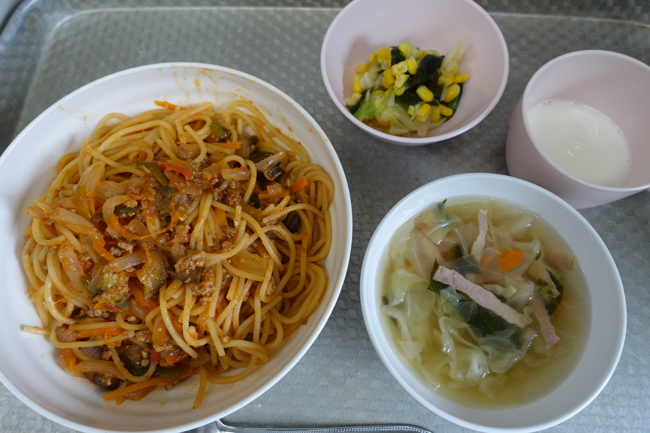 スパゲティトマトソース わかめとコーンのサラダ コンソメスープ 牛乳