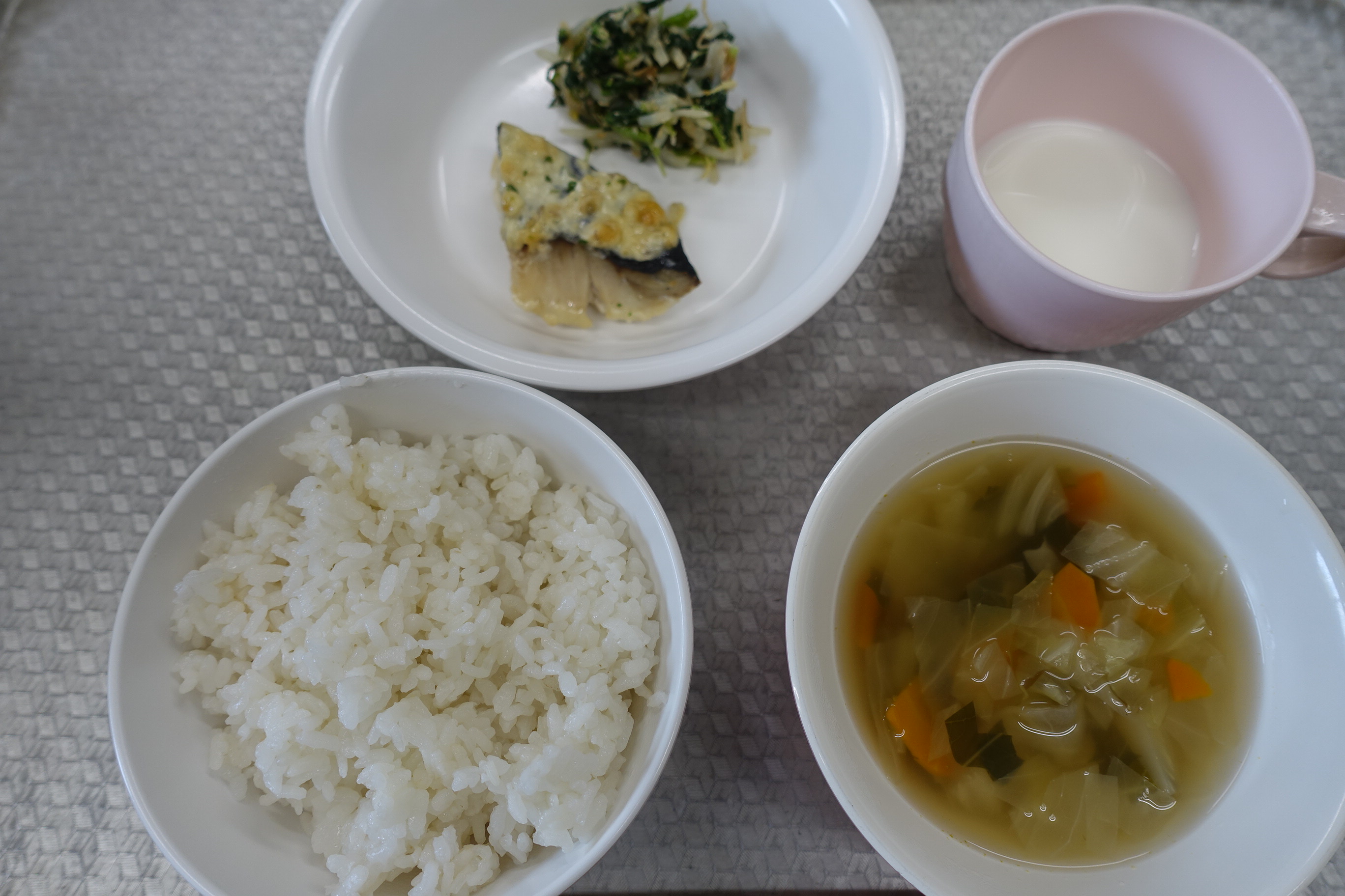 ごはん 魚のみそマヨネーズ焼き おひたし コンソメスープ 牛乳