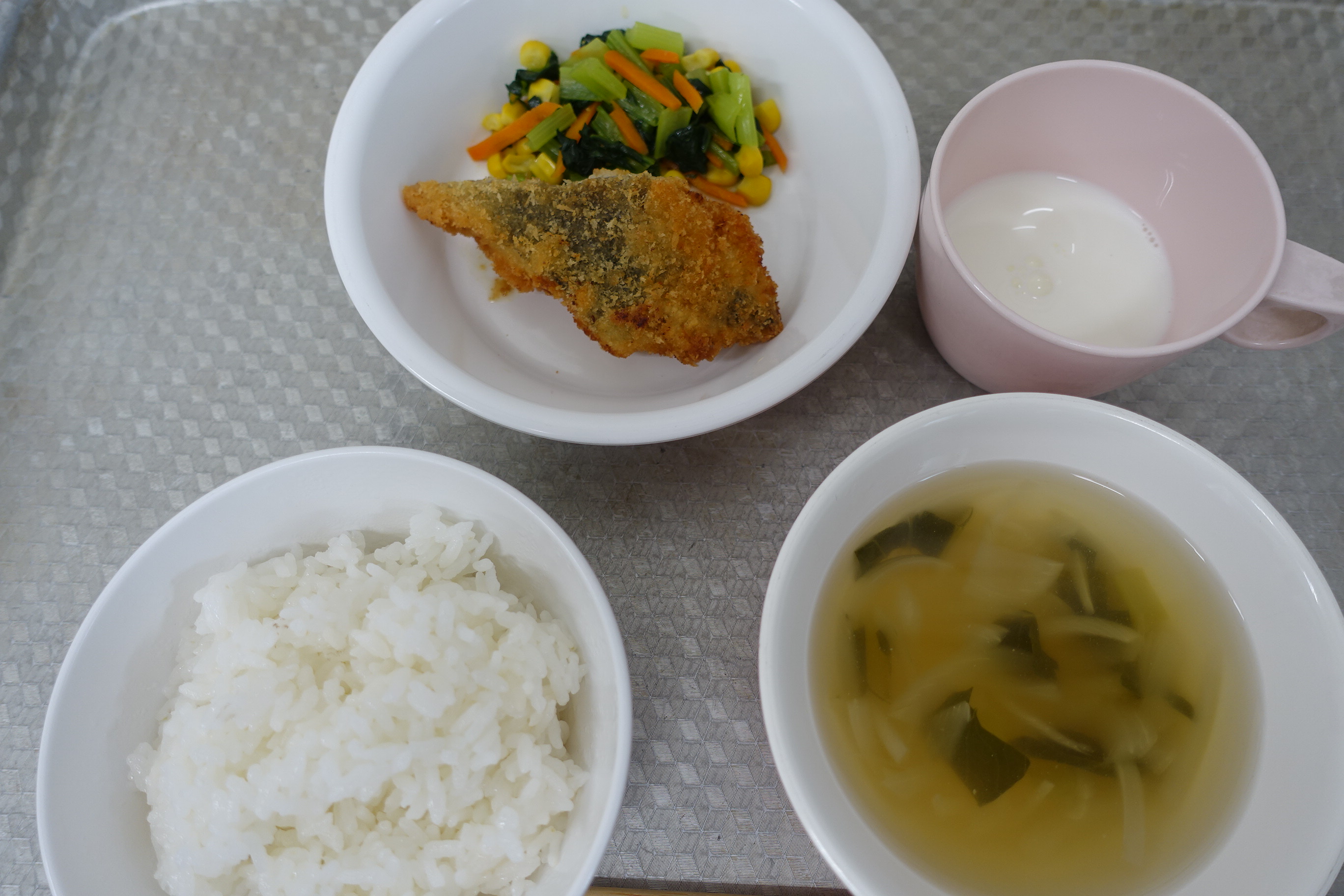 ごはん 魚のフライ 三色野菜のソテー オニオンスープ 牛乳