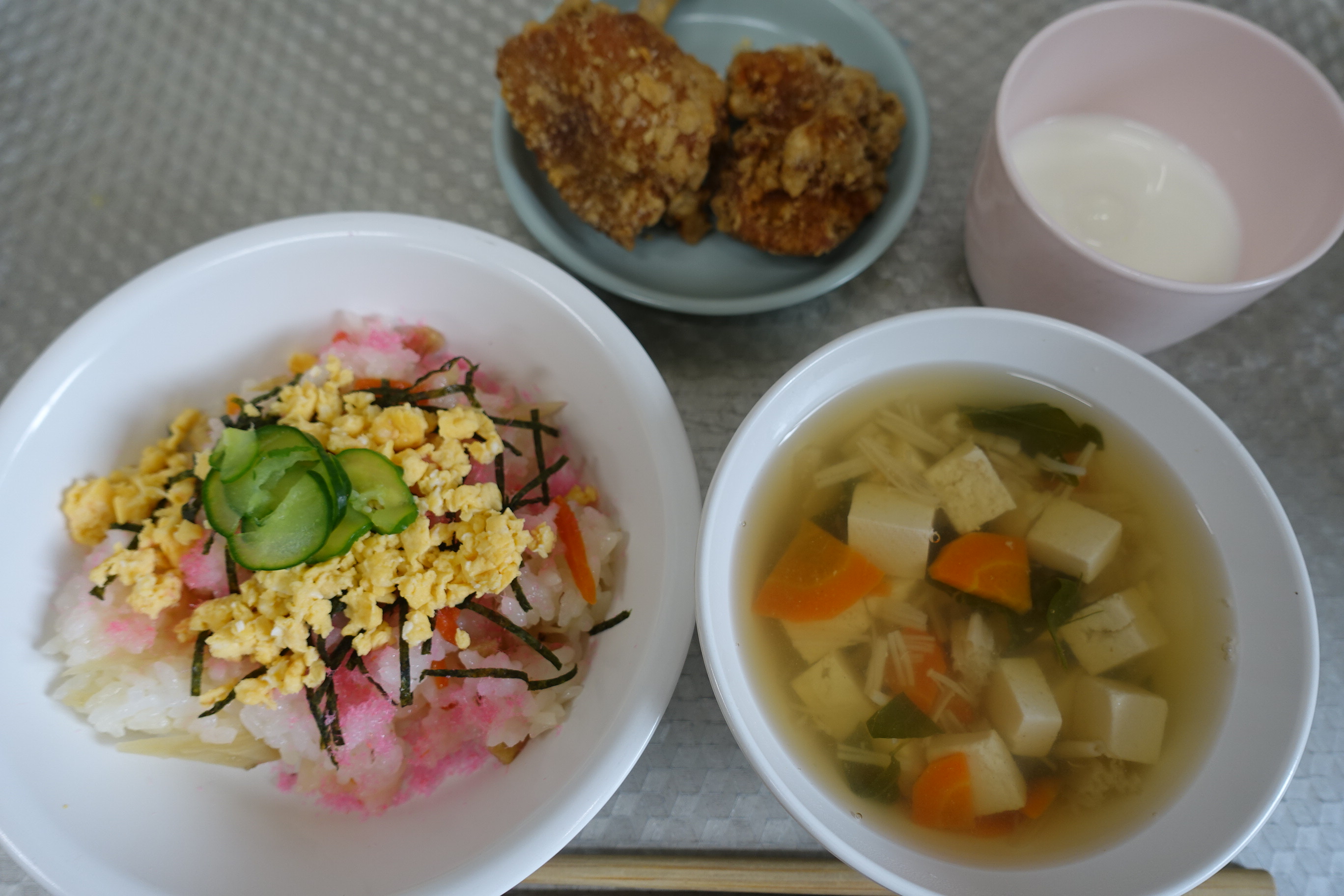ちらし寿司 鶏肉のから揚げ すまし汁 牛乳