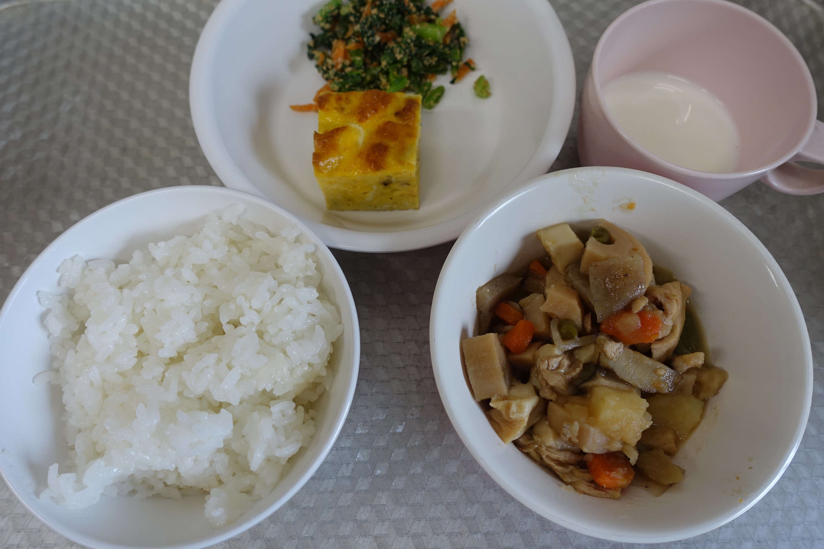 ごはん 卵焼き 小松菜のごま和え 筑前煮 牛乳