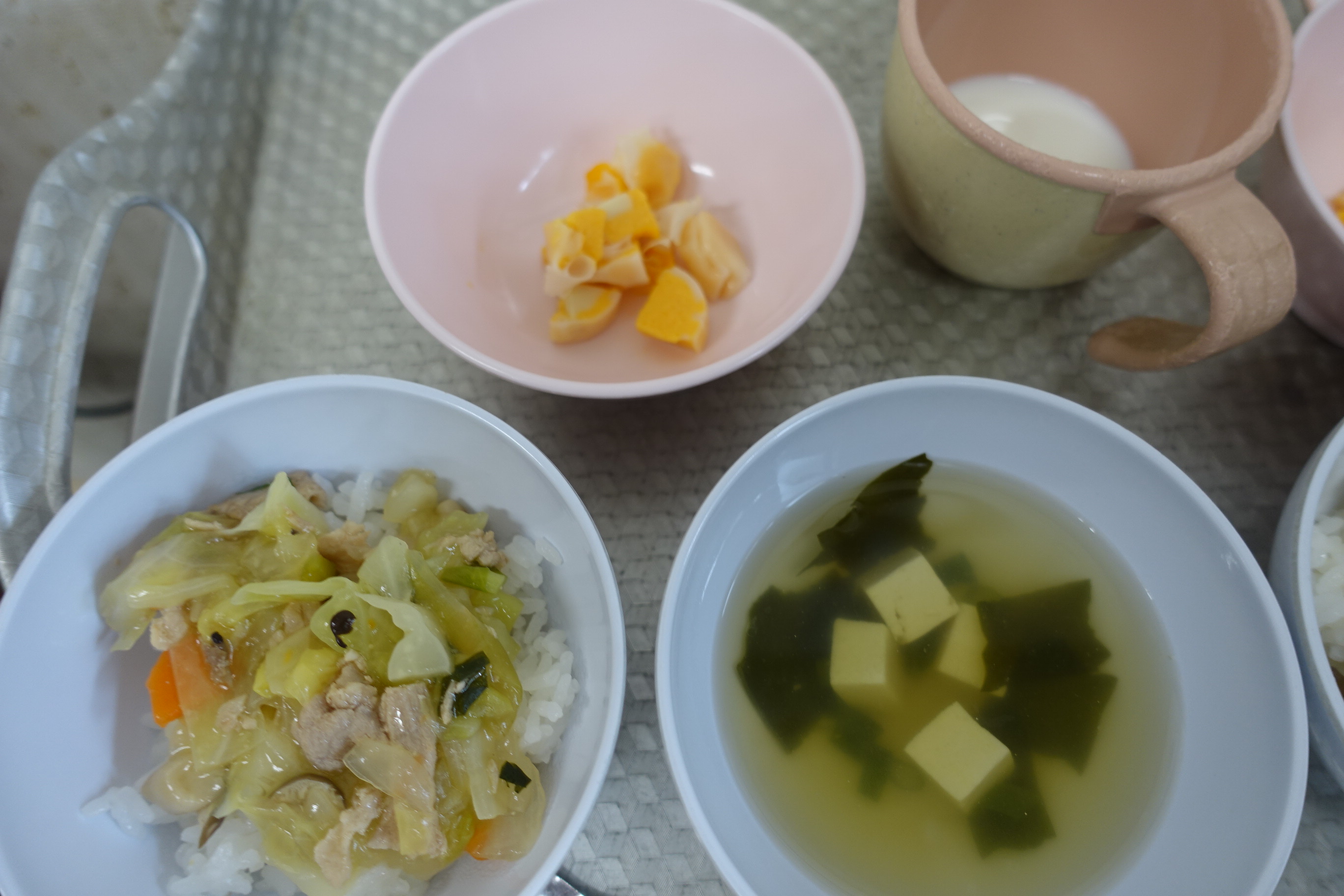 中華どんぶり シューマイ わかめスープ 牛乳