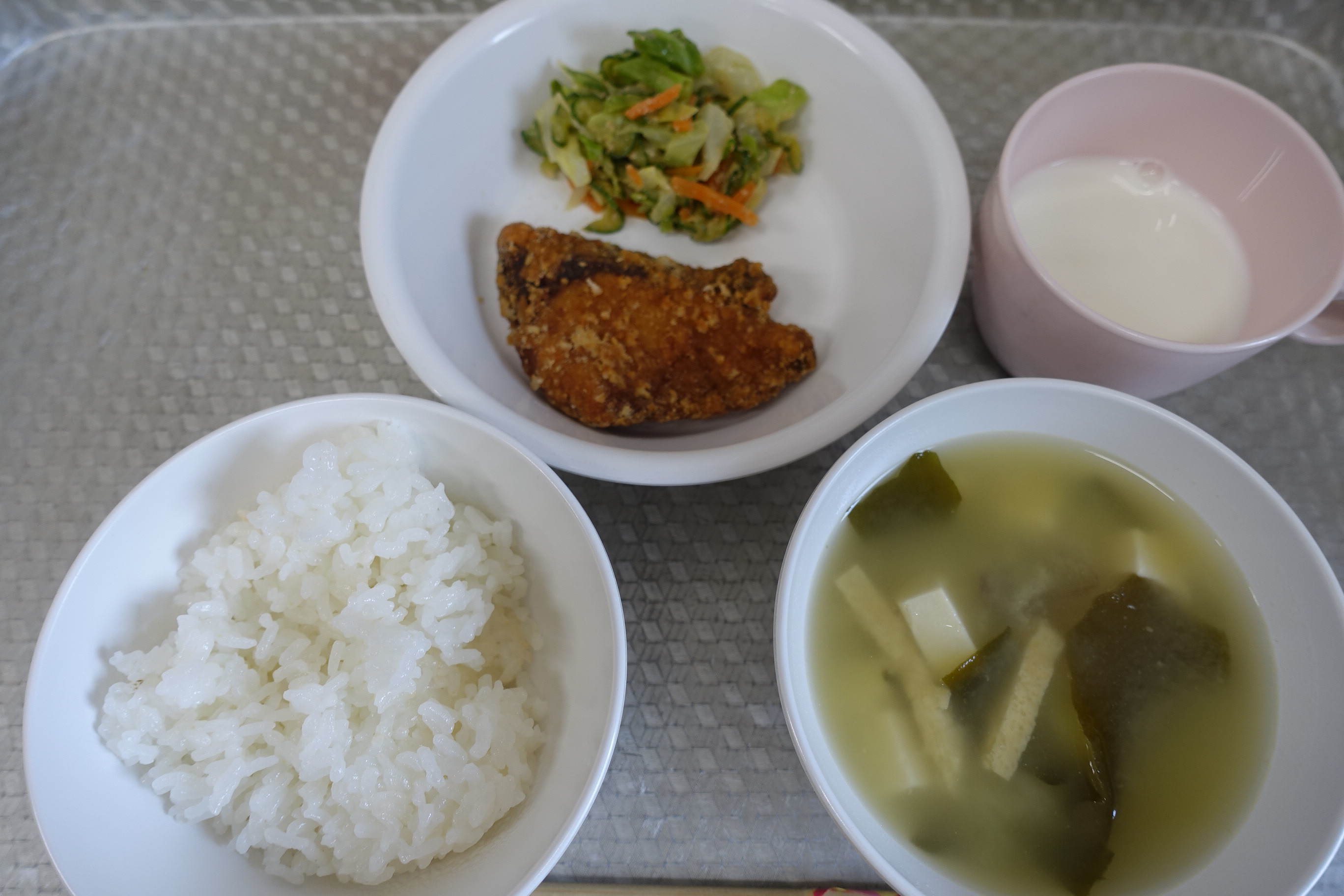 ごはん ハマチのから揚げ ごま酢和え さつまいものみそ汁 牛乳