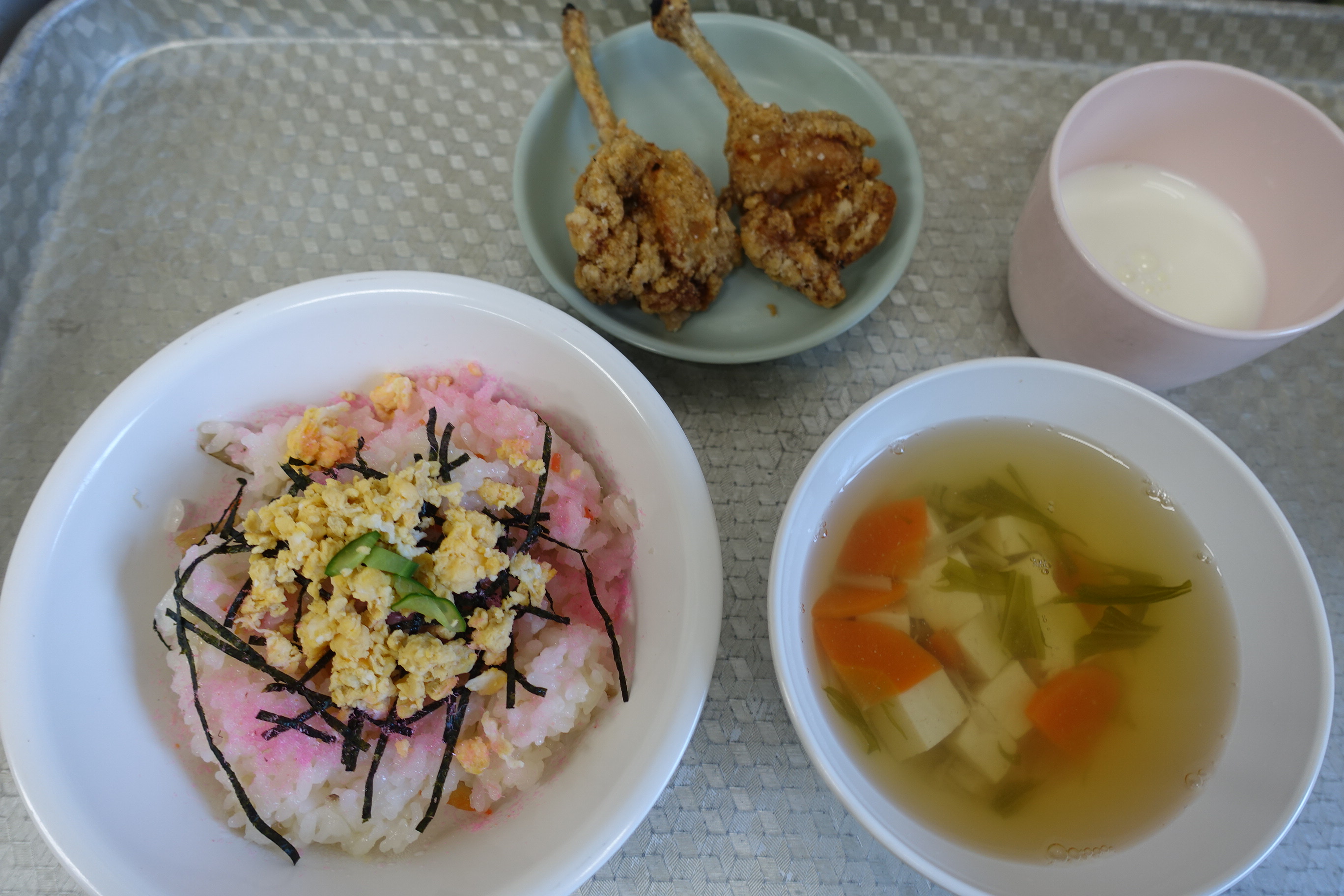 ちらし寿司 鶏肉のから揚げ すまし汁 牛乳