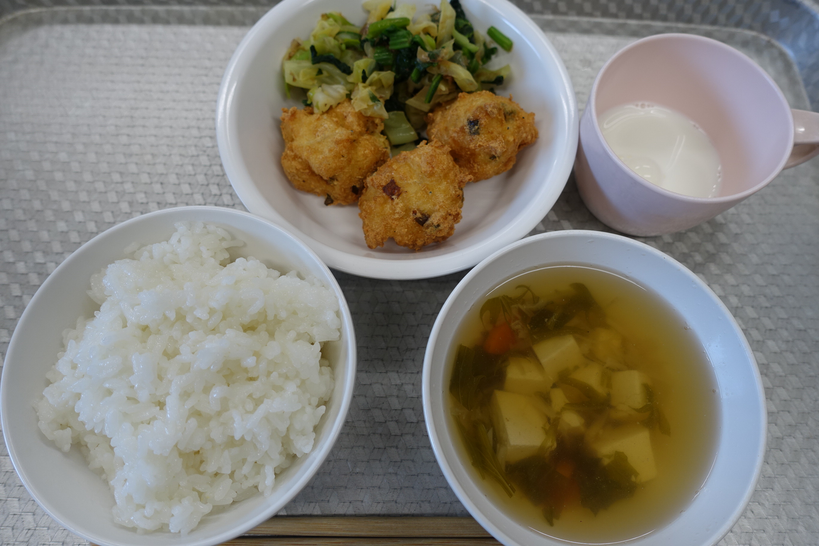 ごはん 豆腐のまさご揚げ おひたし すまし汁 牛乳