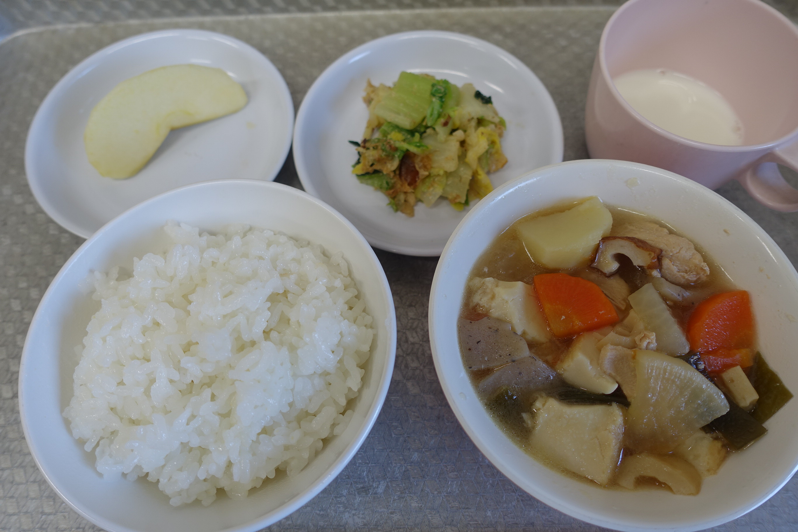 ごはん おでん風煮 白菜のごま和え りんご 牛乳