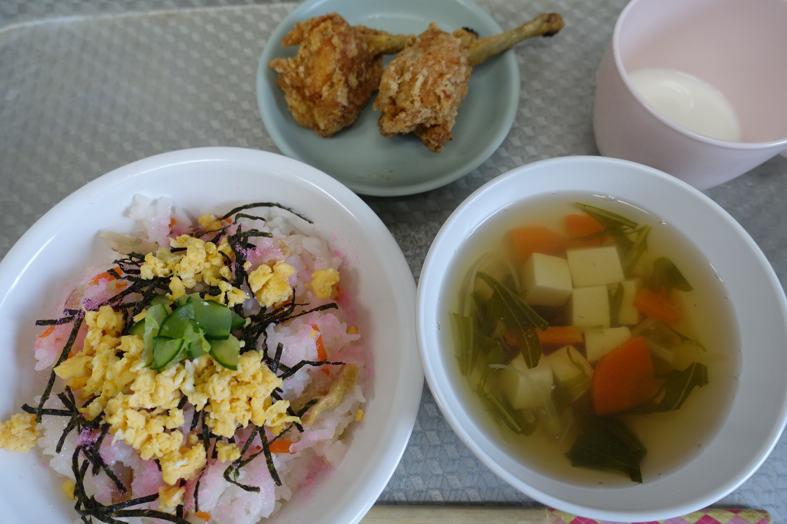 ちらし寿司 鶏肉のから揚げ すまし汁 牛乳