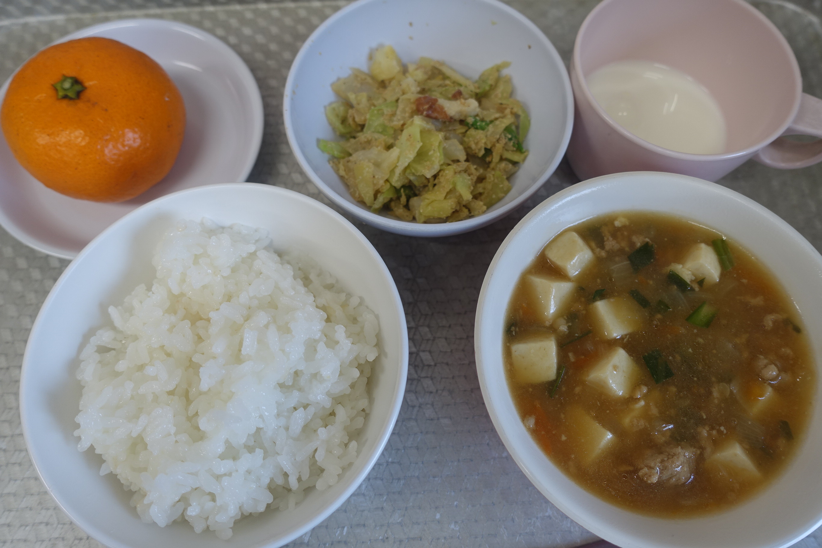 ごはん 麻婆豆腐 キャベツの中華和え みかん 牛乳