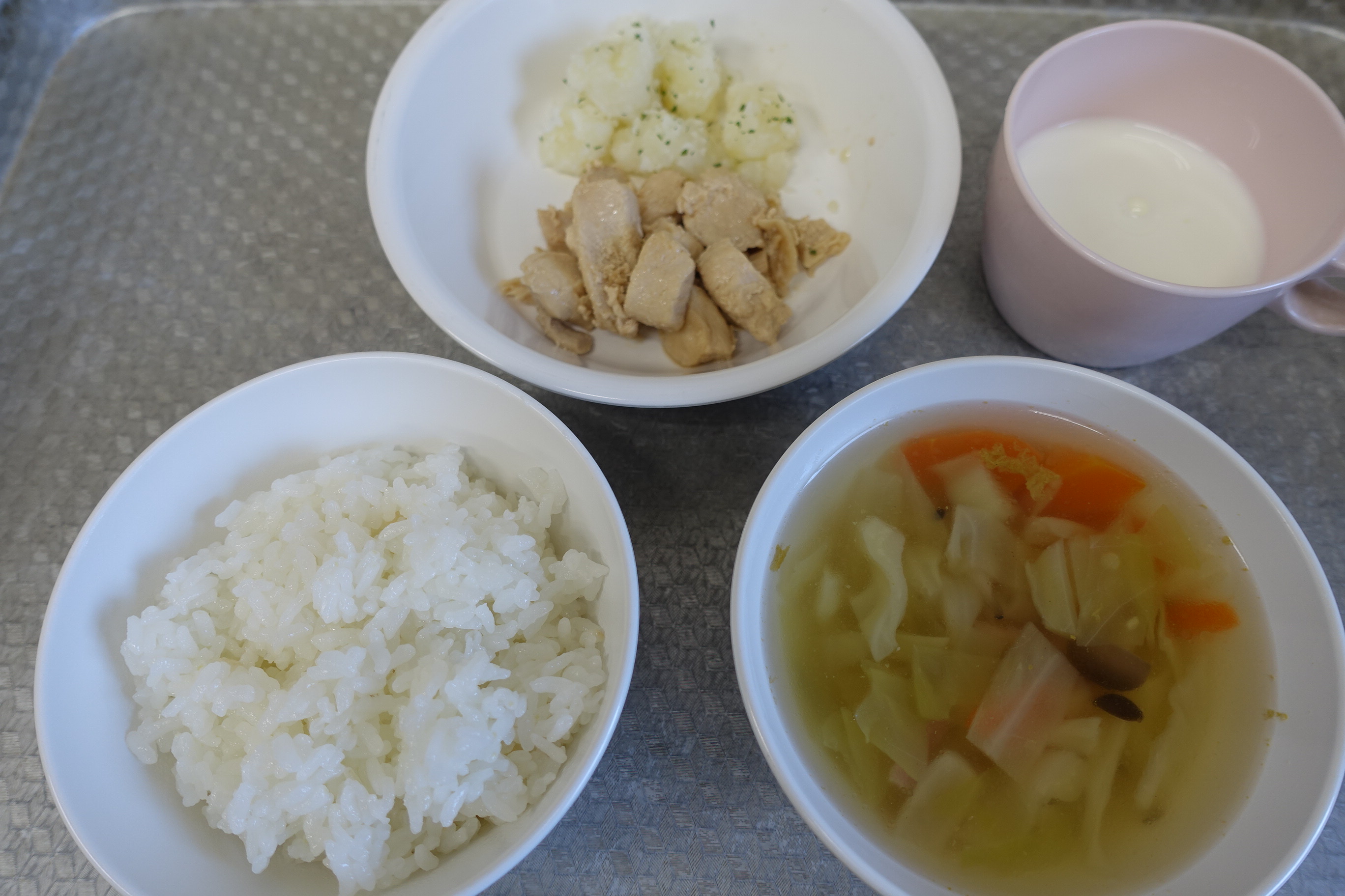 ごはん 鶏肉のポン酢炒め 粉ふきいも 野菜スープ 牛乳