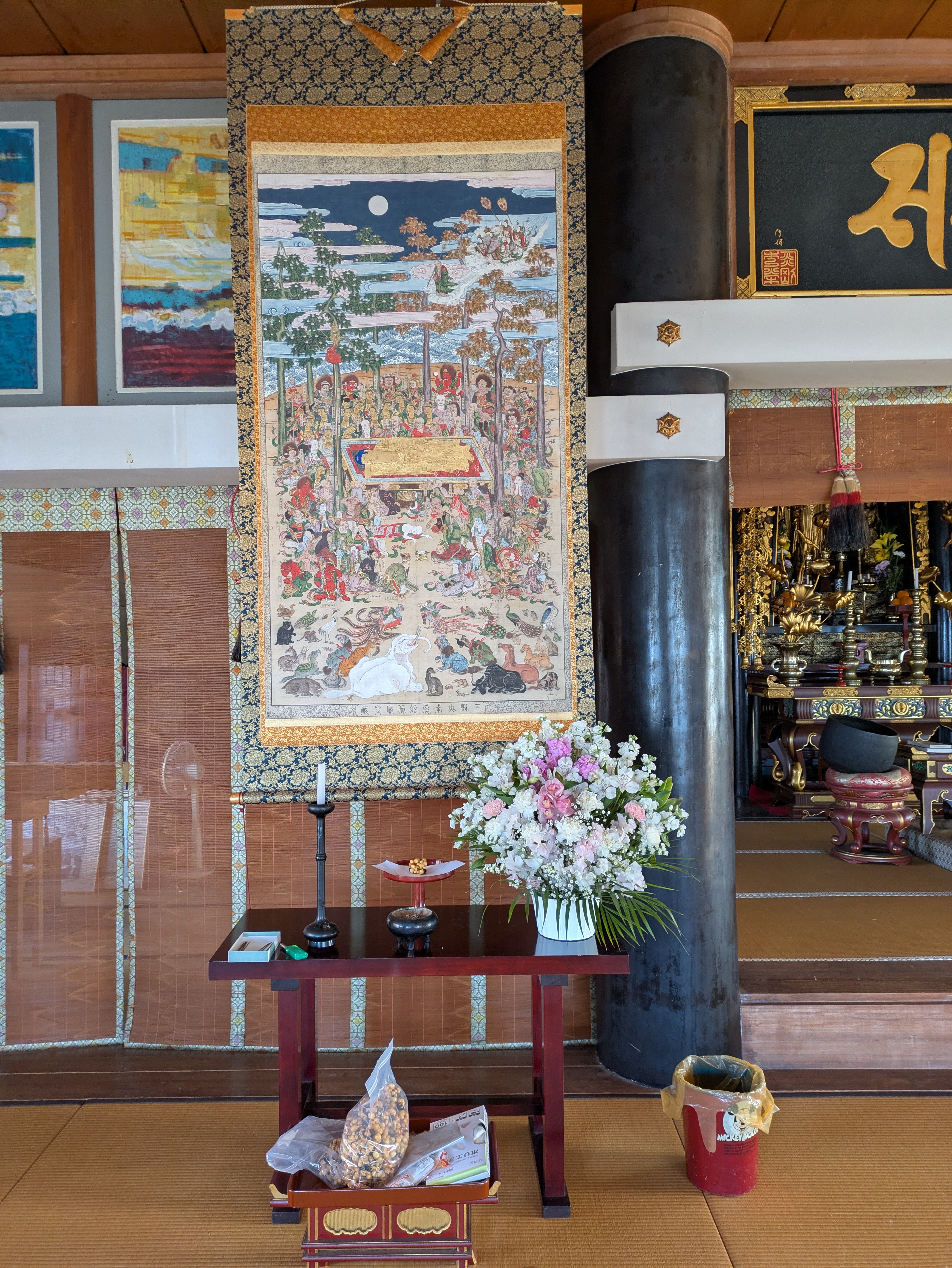 2月15日はお釈迦様の亡くなった日です。(涅槃会)お寺ではお釈迦様の亡くなった時の様子を描いた掛け軸をかけてお勤めをします。