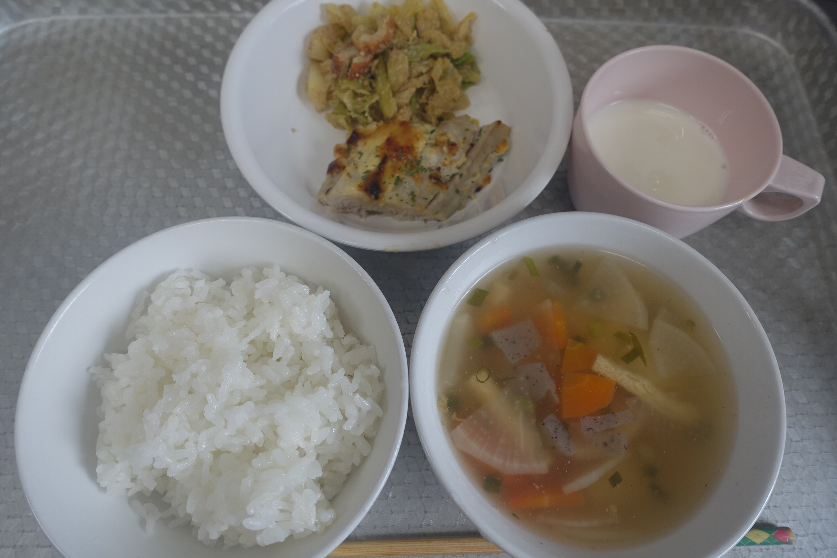 ごはん 魚のみそマヨネーズ焼き キャベツのごま和え のっぺい汁 牛乳