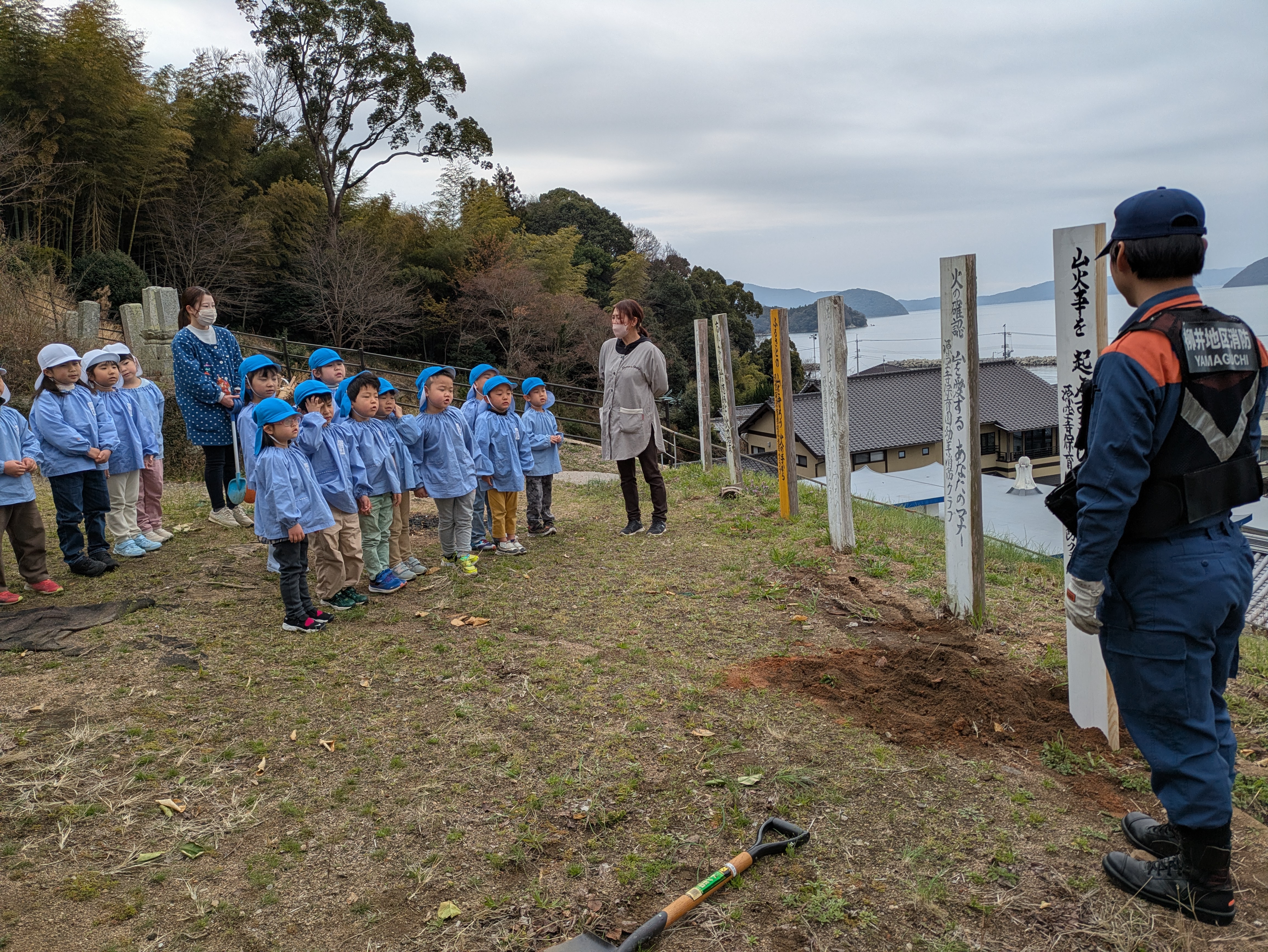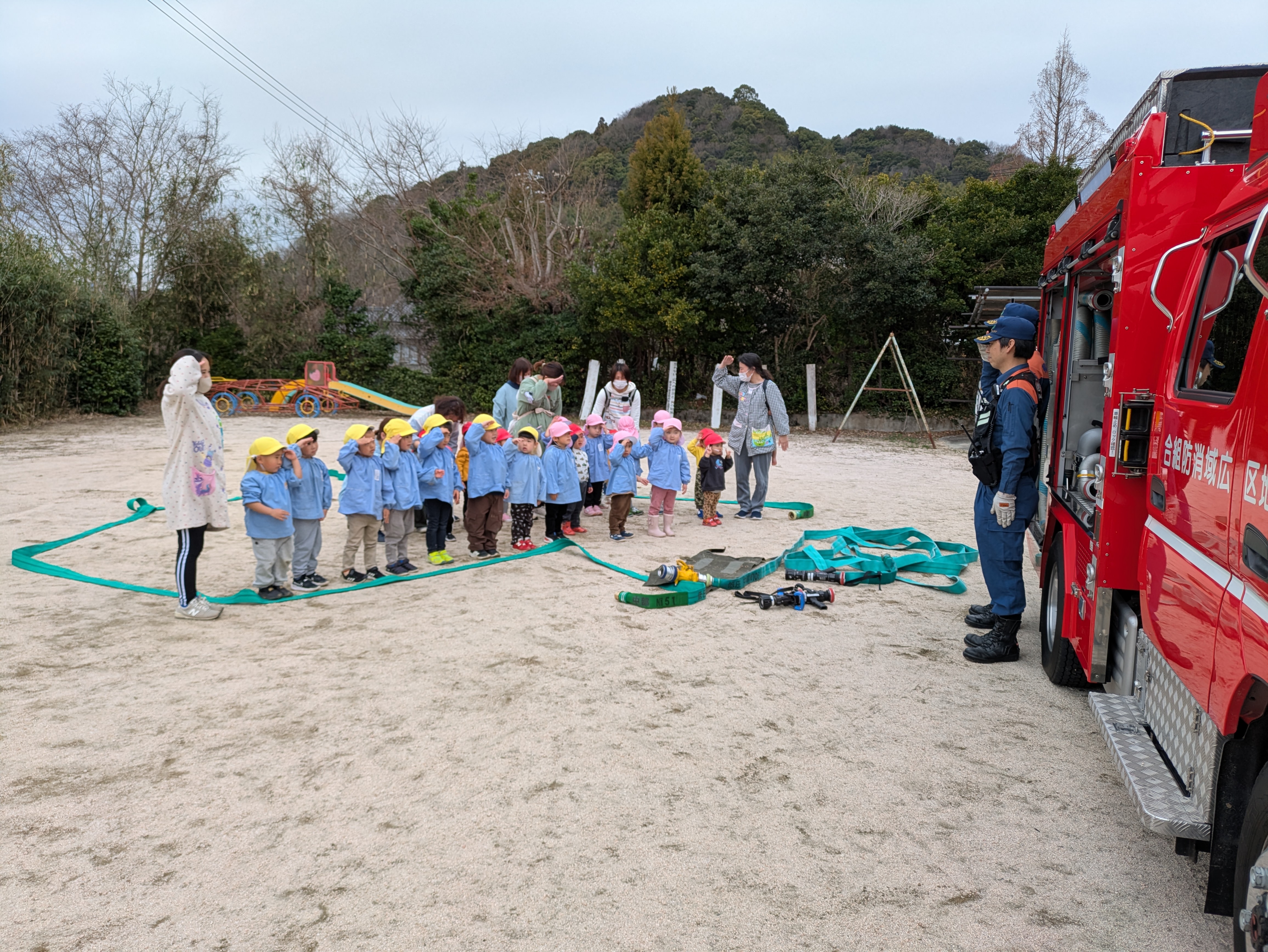 3月6日に消防署から消防士さんに来ていただき避難訓練をしました。午後は保護者への引き渡し訓練を実施し、全員時間内に保護者にお子さんを渡すことができました。