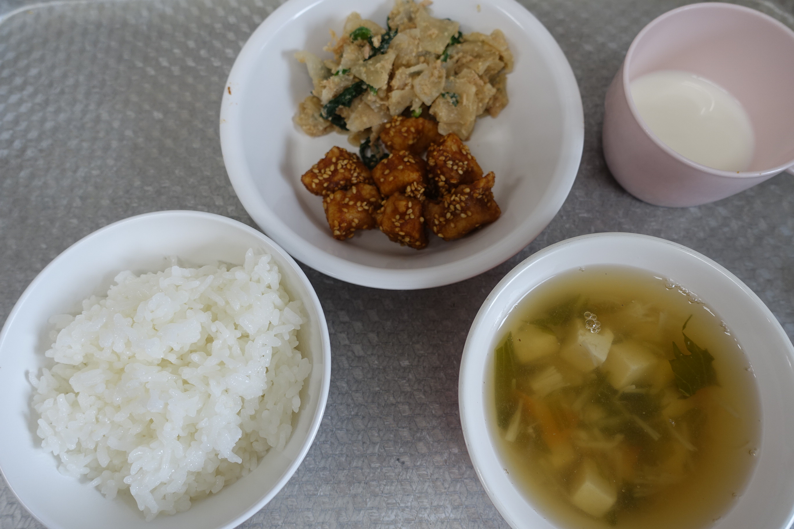ごはん 鶏肉のみそがらめ 大根のツナ和え とうふ汁 牛乳