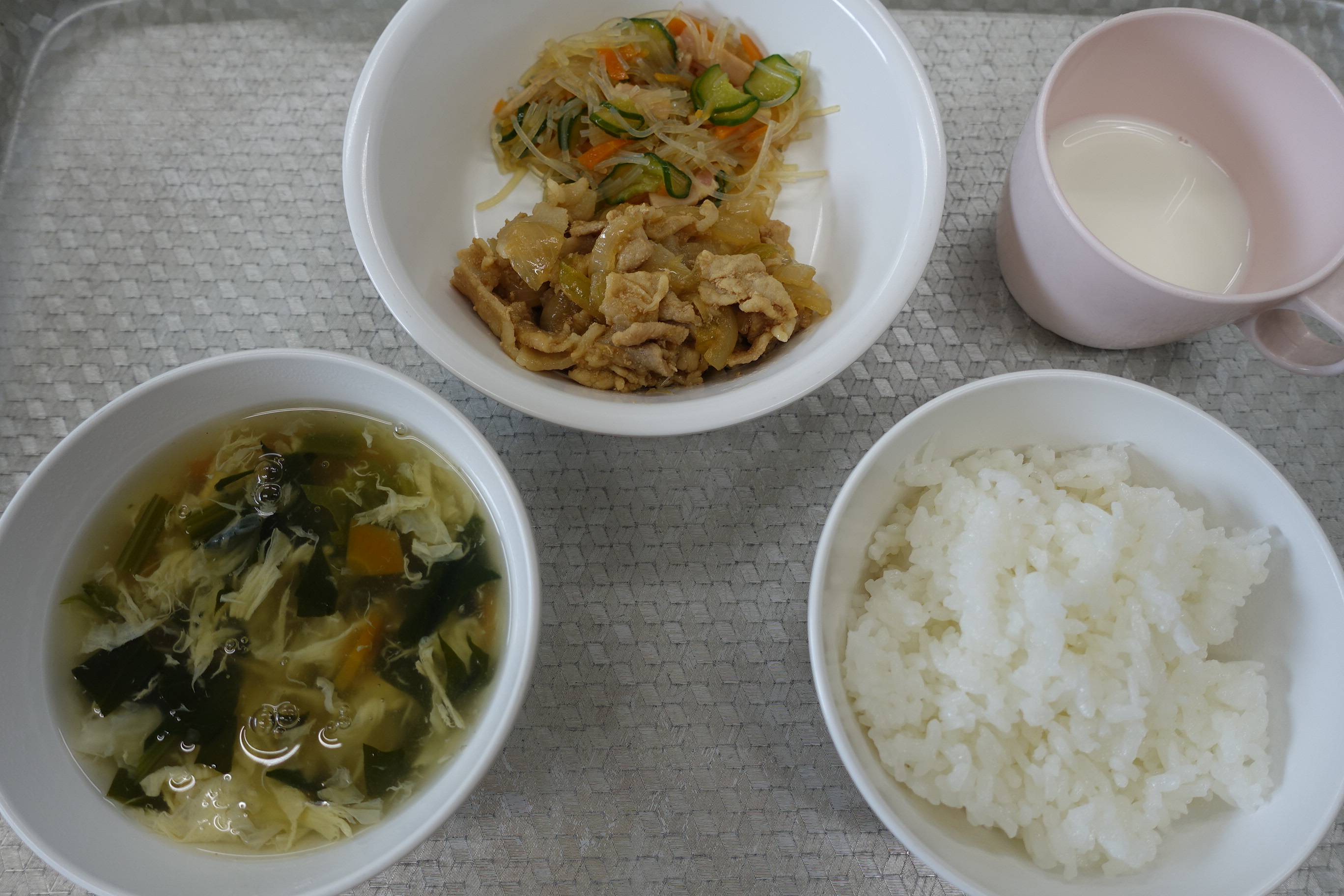 ごはん みそ焼き肉 バンサンスー かきたま汁 牛乳