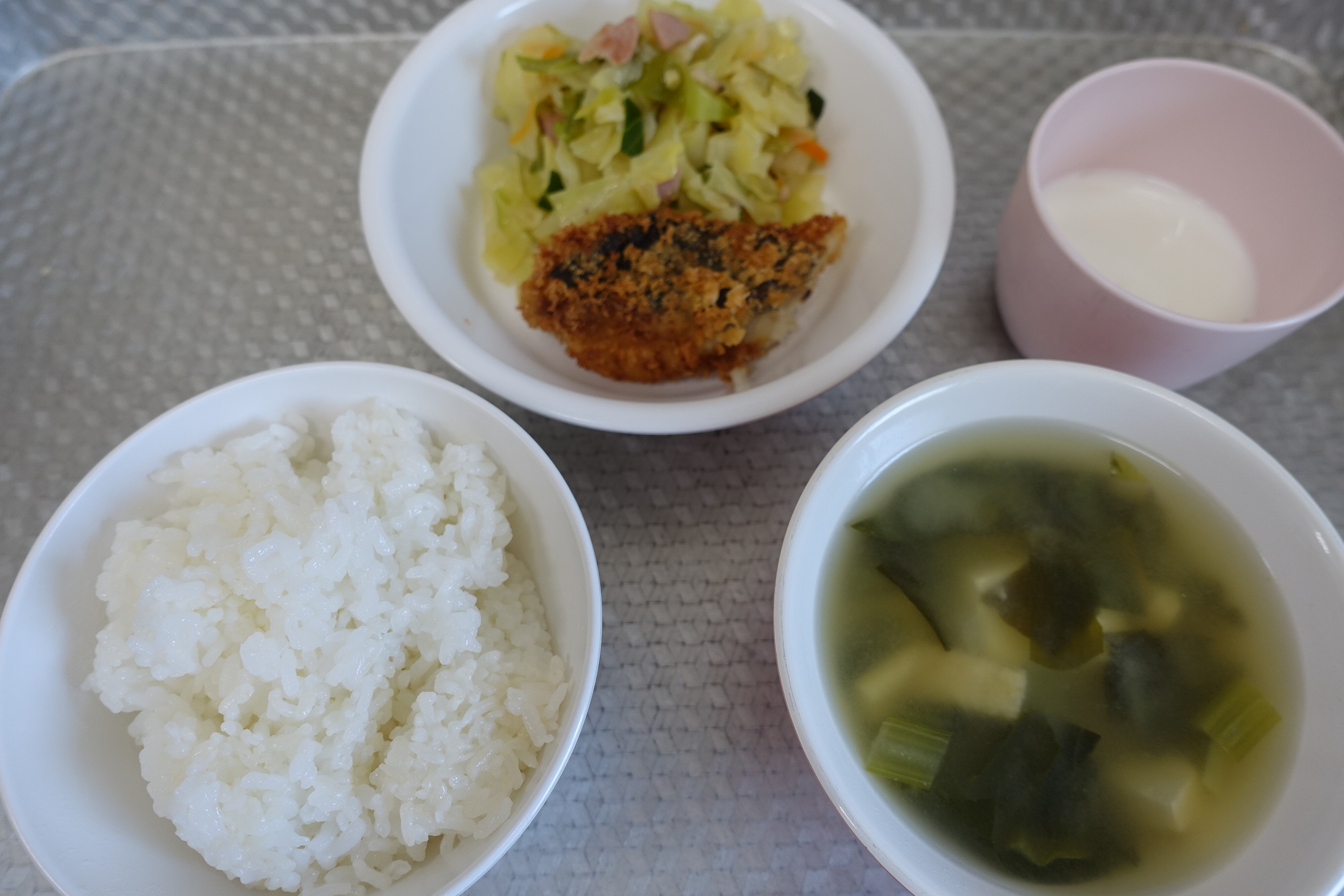 ごはん 魚のフライ 野菜のソテー 小松菜の味噌汁 牛乳